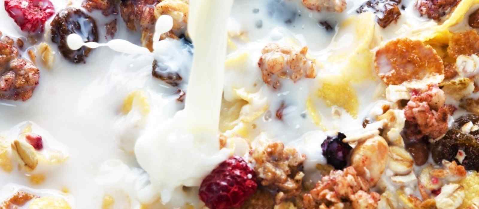Gesundes Frühstücksmüsli mit frischen Beeren und Milch, reich an Ballaststoffen für eine ausgewogene Ernährung.